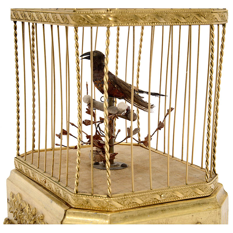 Manufacturer probably Bontems, gilt-brass cage on gilt wood base, going-barrel movement with bellows wound from the underside, bird on brass perch with cloth flowers and leaves, with three motions (head, beak and tail), good original working condition, bi