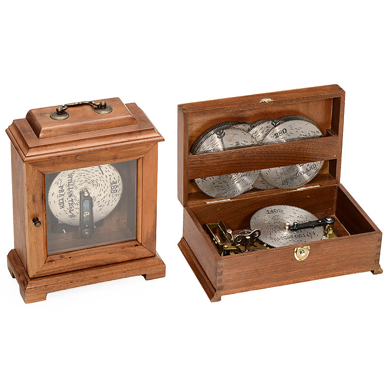 Table models for pinion-driven 4 ½ in. discs. 1) Vertical clock case model, height 10 ½ in. – And: 2) Musical casket, disc storage in lid, width 11 in. – With 14 discs, working.