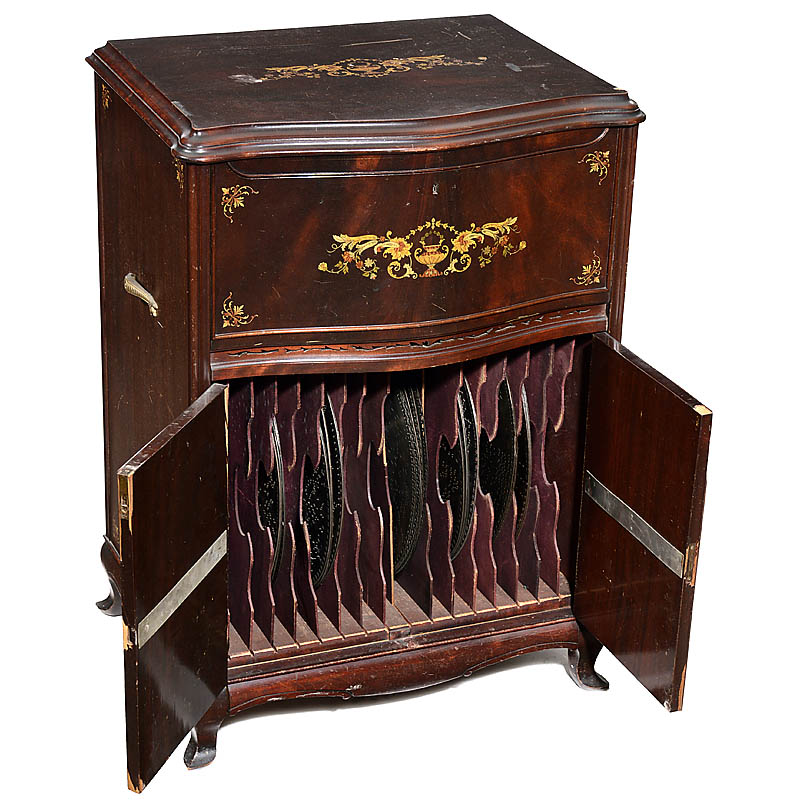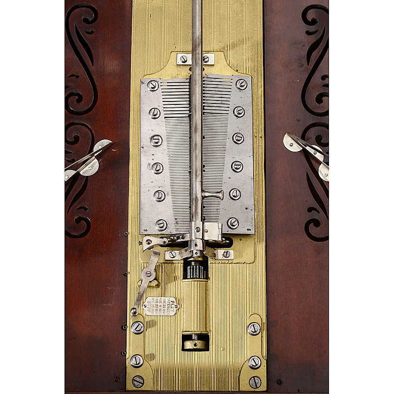 Manufacturer: Mermod Frères, Switzerland, 162 teeth in duplex comb (complete), speed control, mahogany cabinet with rare original transfer decoration, disc storage compartment in the base, excellent playing condition, with 20 discs. A superb example of th