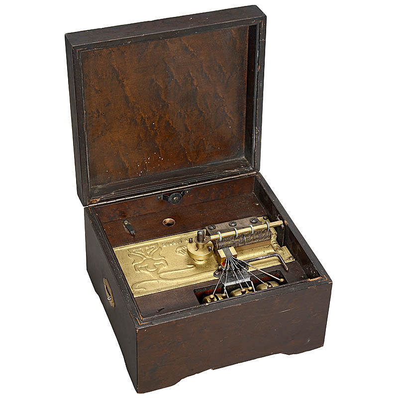 For 9 ½ in. discs, 6 optional bells, steel comb not complete, wooden case with Symphonion lettering and Art Nouveau flowers on the lid. Needs restoration. A small and rare instrument.