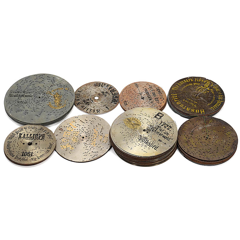 1) 22 Adler Ø 7 1/16 in. – 2) 17 Polyphon Ø 6 ½ in. – 3) 5 Kalliope Ø 5 3/8 in. – 4) 11 Polyphon Ø 8 1/8 in. – 5) 3 Komet Ø 6 5/8 in. – 6) 4 Edelweiss Ø 4 ½ in. – And: 7) 1 Imperator Ø 5 3/8 in.