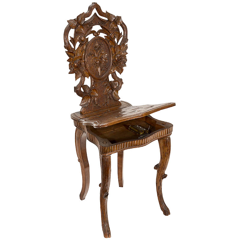 Carved walnut, decorated with flowers and leaves, front legs carved like antlers, Swiss 2-air movement under the seat, as soon you are sitting down, the music plays. Height 36 in.