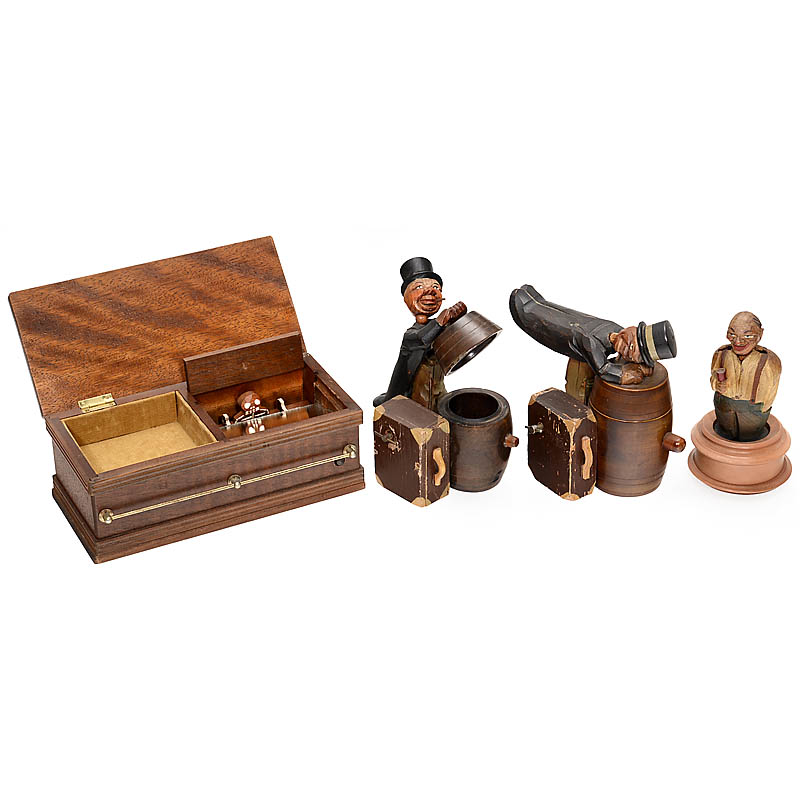 1–2) 2 "drunken travelers", hand-carved lime wood, musical movements in the suitcases, released by opening the barrel. – 3) Drinker figure, hand-carved, 1-air movement, head as bottle opener. – And: 4) Jewellery casket, 1-air movement playing "Funeral Mar
