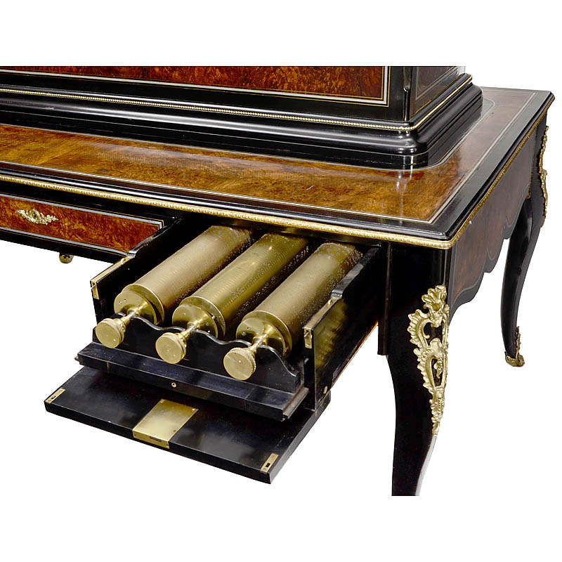 No. 5128, probably by Heller, with six twelve-air cylinders accompanied by 38-key organ, nine engine-turned graduated bells with brass finials, snare drum and castanets, 49 teeth in the two musical and 21 teeth in the three percussion combs (all complete)
