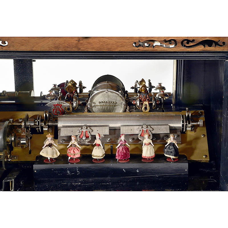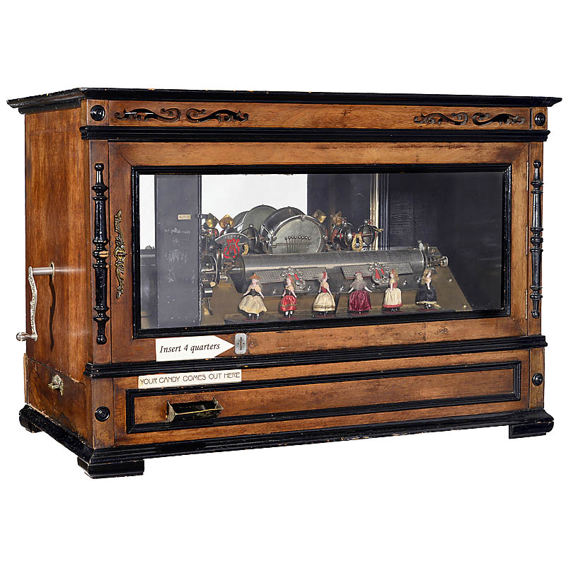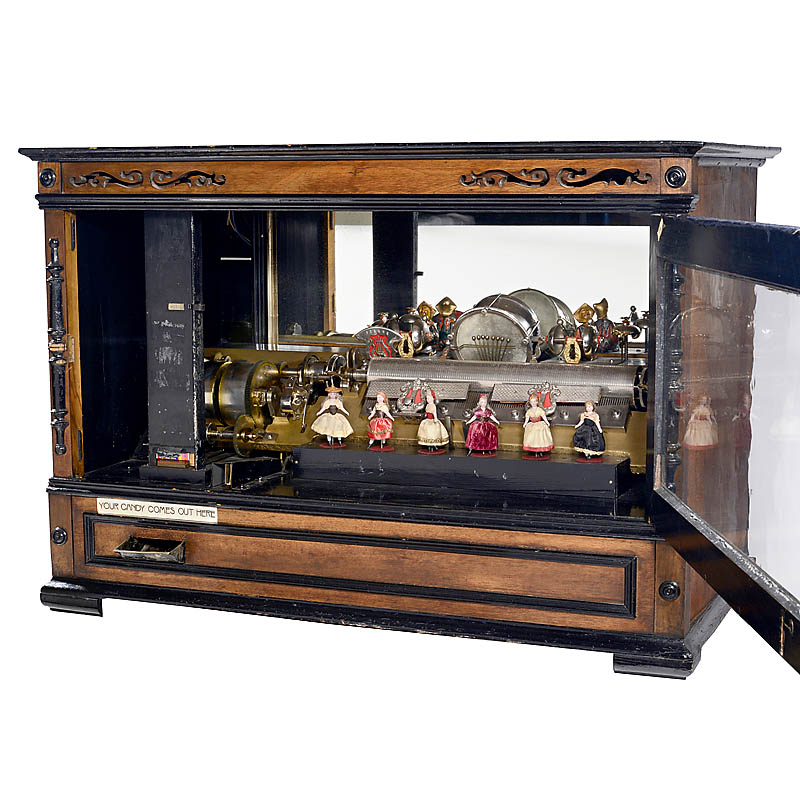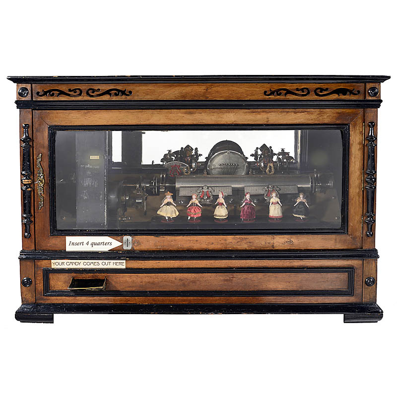 Possibly by Henri Vidoudez, Ste. Croix, No. 13909, with four 6-air cylinders, nickel-plated Mermod-type movement with massive crank-wind double-spring motor driving cylinder and gear for candy dispenser, accompanied by 6 dancing dolls and optional percuss