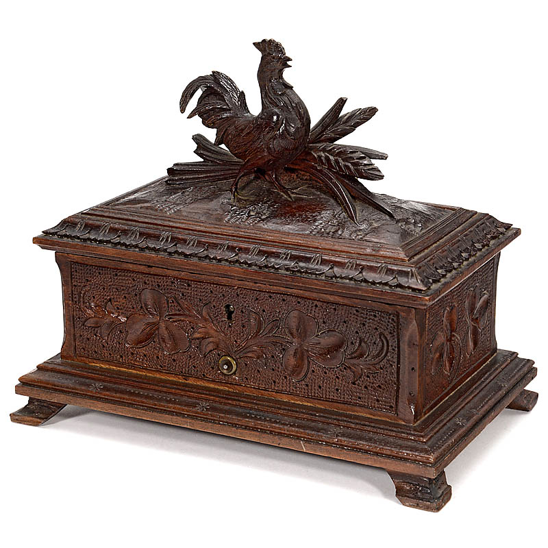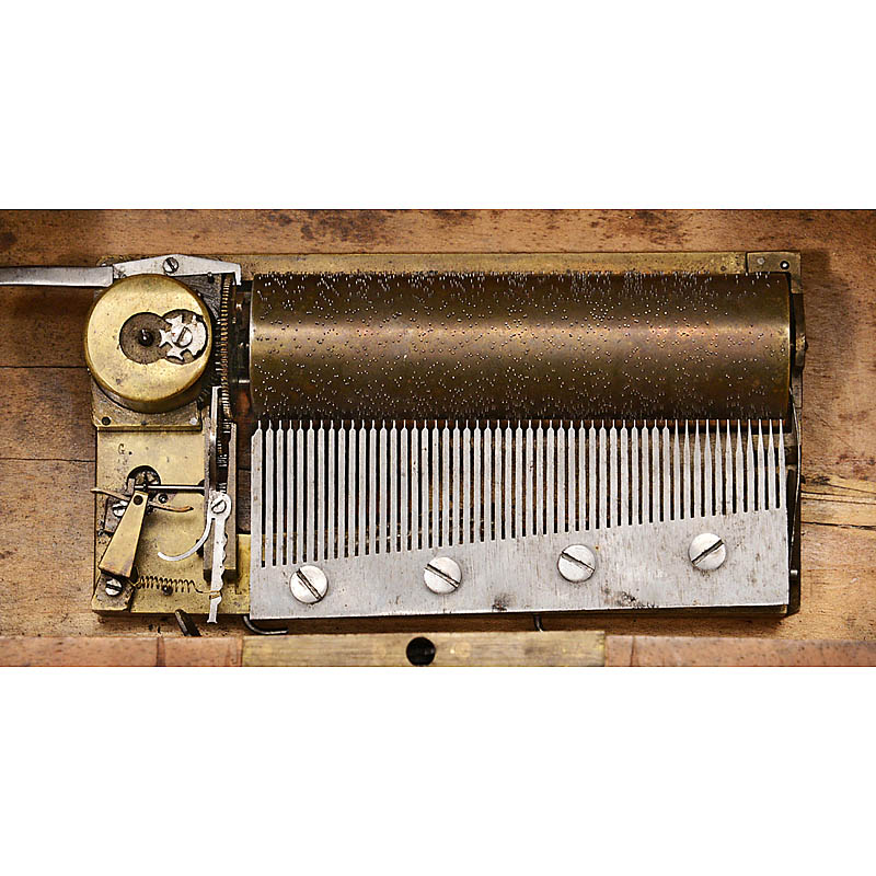 Tabatière movement playing 6 mixed airs including the "Krondiamanten Overture" and "Fra Diavolo Arie", with 51 teeth in comb (complete), tune-sheet and carved walnut case with 3-dimensional rooster and sheaves of corn decorating the lid, width 8 ½ in. (21
