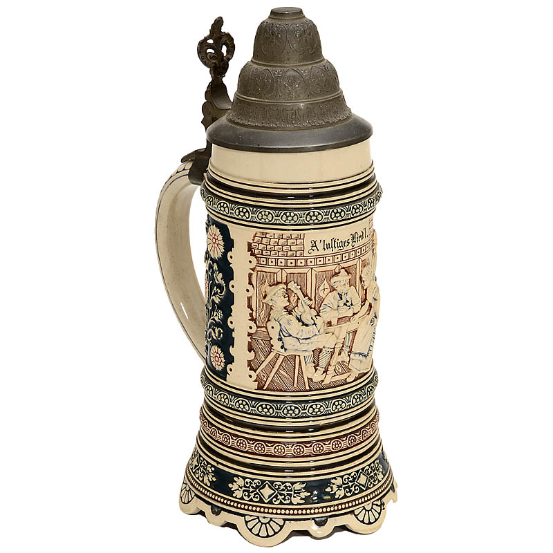 Manufacturer: "Reinhold Merkelbach, Westerwald", model no. 1210, relief, pewter lid, 1 liter, Swiss 2-air cylinder movement in base, height 12 ¼ in. working.