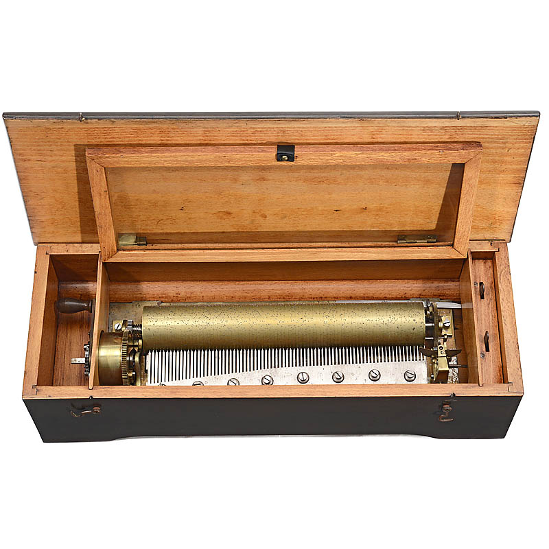 No. 38904, with smooth bedplate, wood-handled winding lever, comb with 79 teeth (complete) and plain case with amber-colored interior, width 20 ¼ in. (51,5 cm), cylinder 11 ¾ in. (30 cm). Good playing condition.