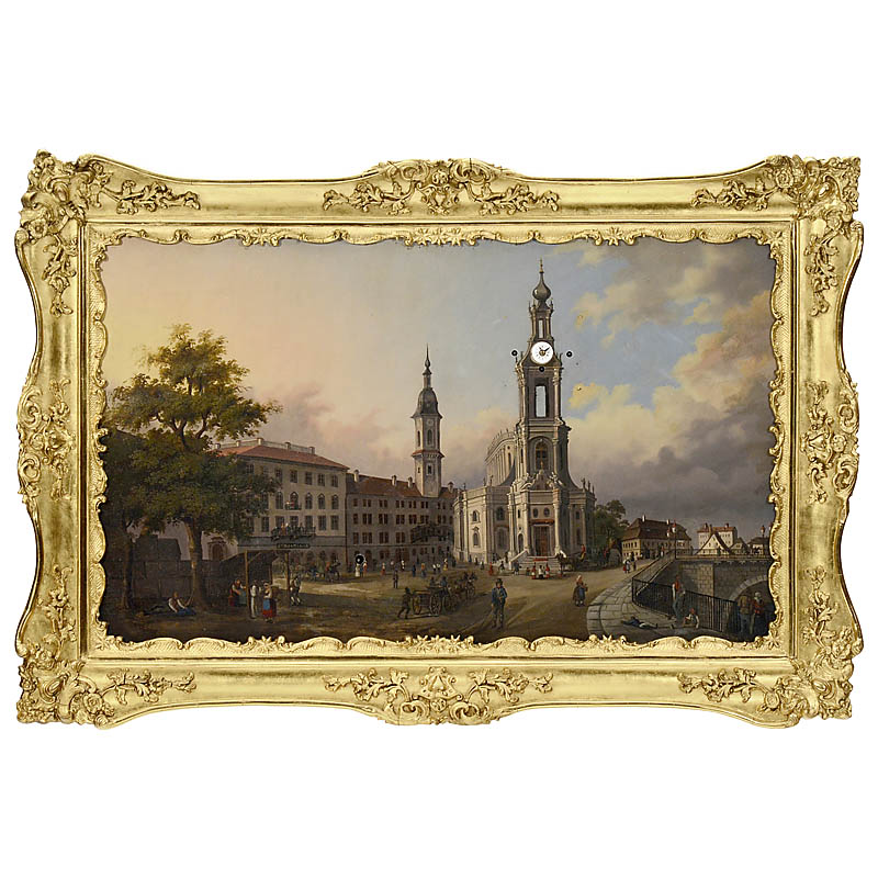 Oil on metal, scene of a town square with enameled dial in baroque church tower, three-train repeater movement striking hours and quarters on gong, angelus striking mechanism and two-air cylinder movement by "Olbrich in Wien", in giltwood gesso frame, 45