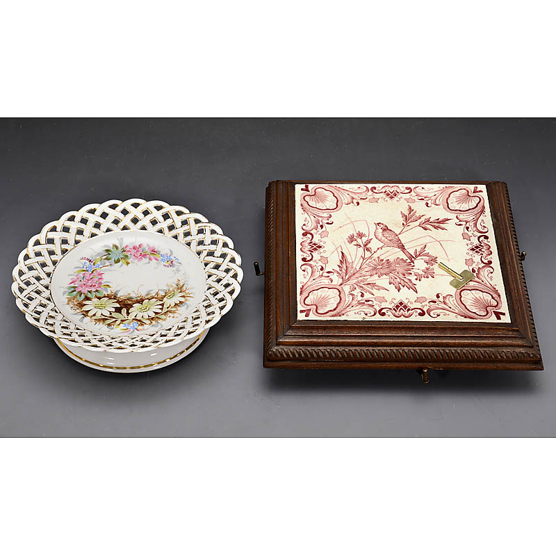 1) Plate by "Carl Tielsch, Waldenburg", hand-painted flower decoration and latticework rim, with Swiss 2-air movement by Heller, working, Ø 9 in., c. 1900. – And: 2) Large tile, c. 1900, wooden base with 3 separately operable movements by "Reuge", c. 1950