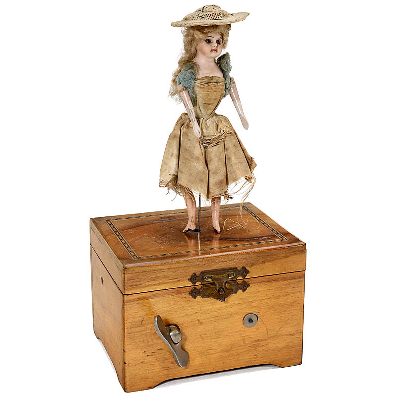 France, with bisque shoulder-head, fixed blue glass eyes, mohair wig, carved wood limbs and original (worn) satin costume, on wood box with lid and long-duration single-air-going-barrel movement that causes Giselle to dance and twirl in time to the music