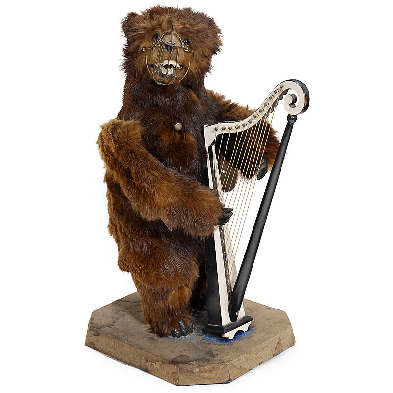 With fur-covered papier-mâché body, carved wood paws, bone teeth, glass eyes, brass muzzle and single-air going-barrel motor, height 13 1/3 in. (34 cm). The bear "plucks" the harp with both paws accompanied by a lively tune, working, but spring slips. Wit