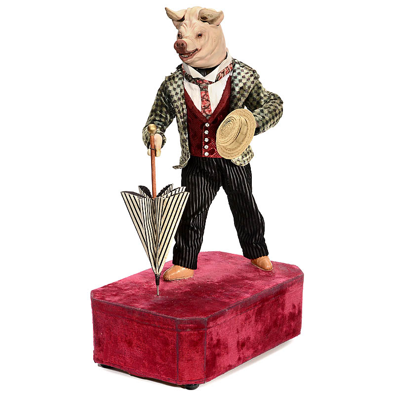 With plaster-composition character head and trotters, glass eyes, articulated ears and snout, on velvet-covered base that contains going-barrel motor playing single air as the pig turns his head, sniffs the air, lifts his ears, waves politely with his lef