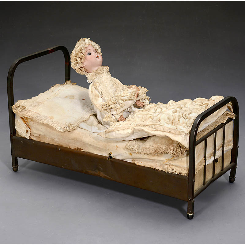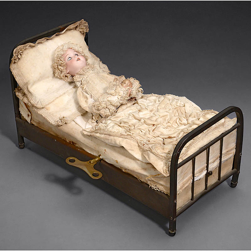 German, mother with Armand Marseille "390" bisque head, open mouth, weighted brown glass eyes, celluloid hands and baby, in brass-framed bed containing open-spring mechanism that plays a single air as the mother rises, rocks her baby and moves her head as