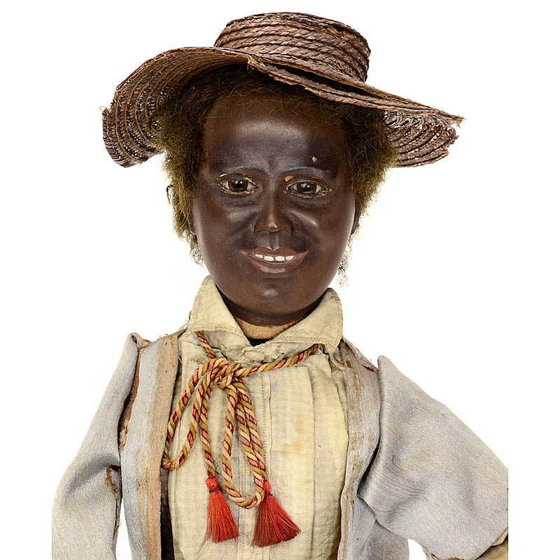 With head modeled as a young black boy with smiling expression, brown glass eyes, articulated eyelids and original mohair wig, sitting on the top rung of a white-painted chair that houses going-barrel movement playing a single air as the musician turns an