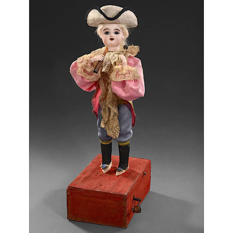 Probably by Renou, with French bisque head impressed "FG" (in cartouche) for Frères Gaultier, open mouth, fixed blue paperweight eyes, pierced ears, blonde mohair wig and bisque hands holding baton and a cheroot-holder, on velvet-covered base containing g