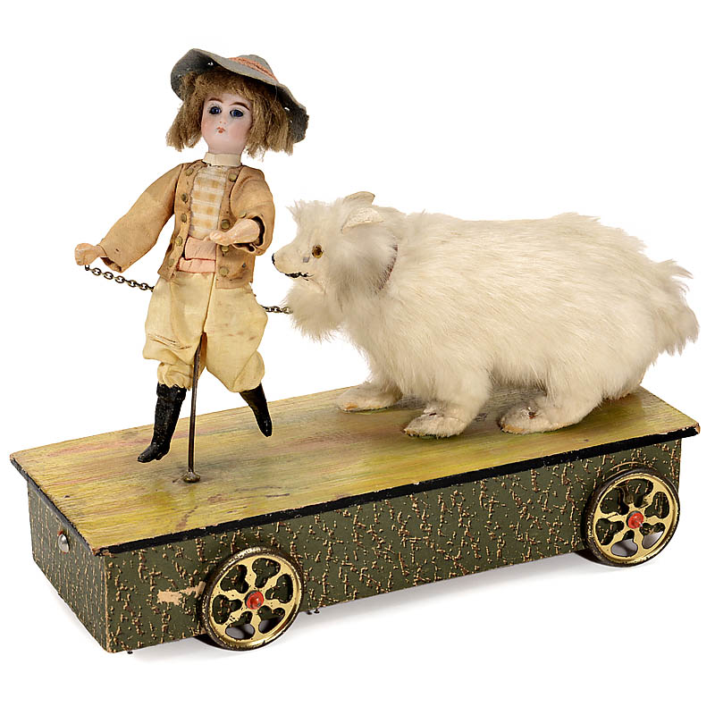 Depicting a bisque-head boy walking fur-covered polar bear, boy with closed mouth, fixed blue glass eyes, mohair wig and original satin costume, on painted and paper-covered wood platform with spoked wheels causing boy to turn from side to side, bellows f