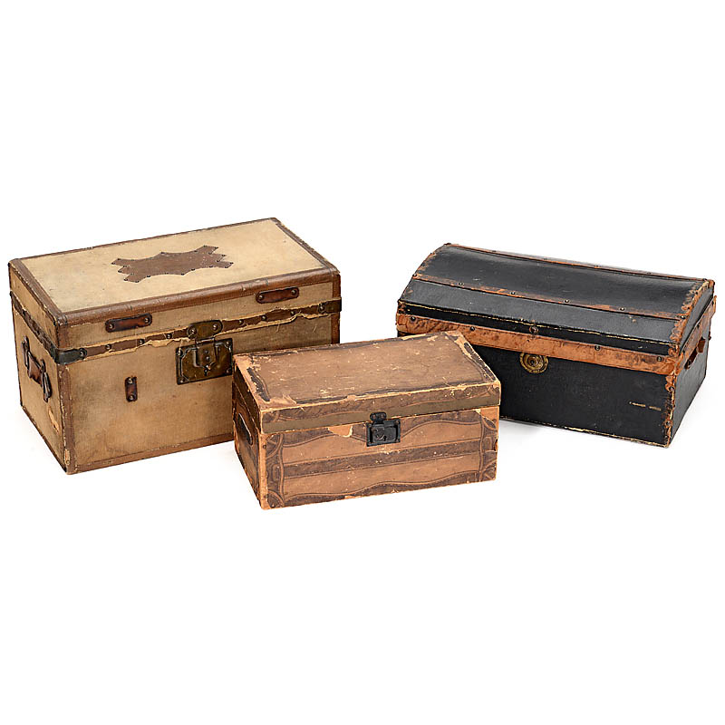 Domed-top painted imitation leather trunk with brown leather trim and handles, width 13 ¾ in. (35 cm). – 2) Leather-bound canvas-covered trunk, stamped "L.P. Déposé" on the catch, width 13 ¾ in. (35 cm). – And: 3) Paper-covered trunk, width 11 in. (28 cm)
