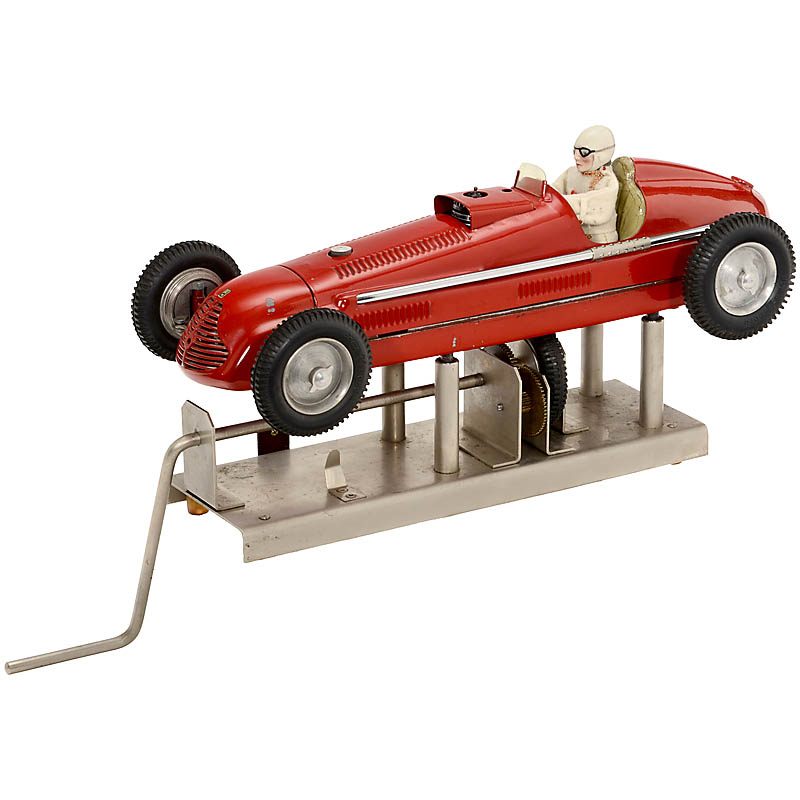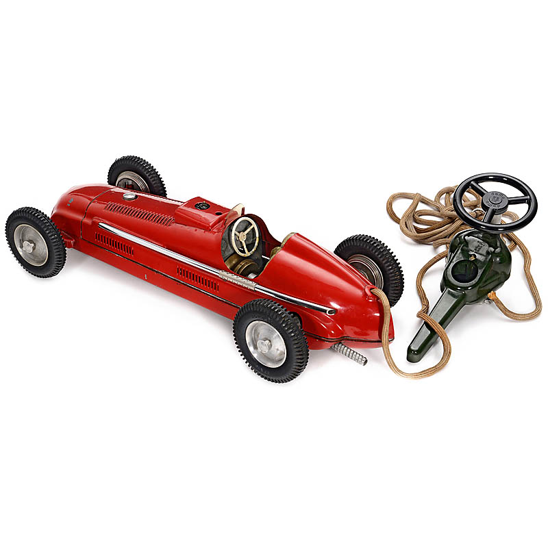 Model: "Maserati – Grand Prix de San Remo", manufacturer: Domo, Torino, Italy, serial no. 410074, original driver figure with porcelain head, red painted aluminum case, rubber tyres, steerable front axle, internal combustion engine, pneumatic remote contr
