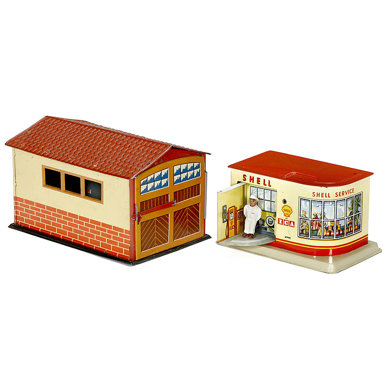 1) Distler garage, length 7 ½ in., c. 1935. – And: 2) Michael Seidel, Shell petrol station with money bank, put a coin in the slot and the operator appears, 6 ¼ in. wide, c. 1955. – Lithographed tin.