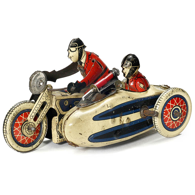 No. 756, with sidecar, lithographed tin, clockwork (sticks), length 4 in.