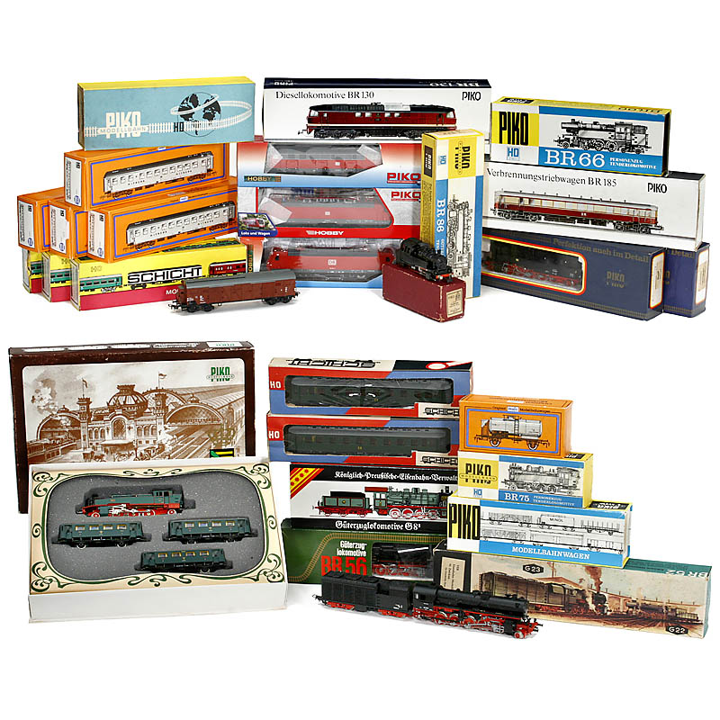 By "Pico", "Gützold", "Prefo", "Schicht" and "VEB Modelleisenbahnen, Dresden". 9 steam locomotives, 4 diesel locomotives, 2 electric locomotives and 11 wagons. All in original boxes.