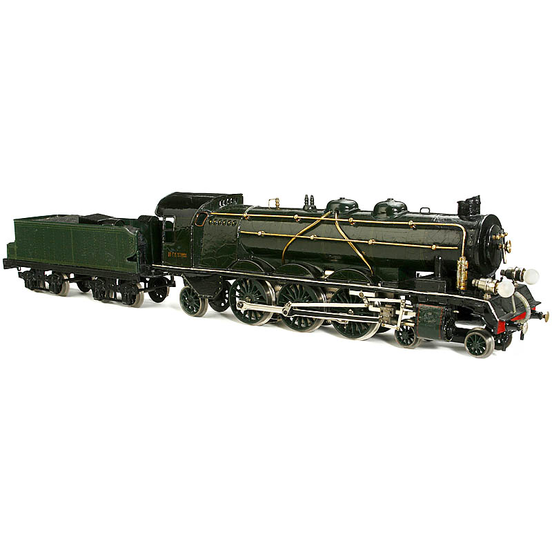 20 volt, 4-6-2 wheel arrangement, bogie wheel tender, hand-japanned tin (partly repainted), electric front light, spring buffers, manual switchover, length 29 ½ in. Very good restored condition.