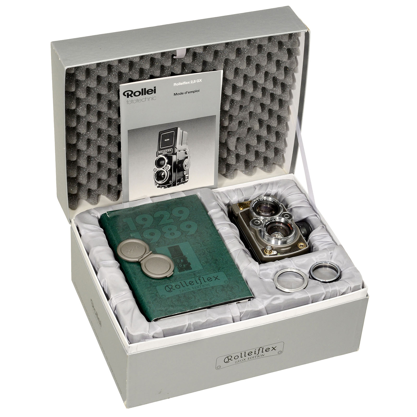 Rollei Fototechnic, Braunschweig. Limited Edition, no. 4016507, only 1,500 cameras produced, first model special edition to celebrate "60 Years Rolleiflex". Planar 2,8/80 mm, no. 8105234, Synchro-Compur, gold-plated metal parts, grey luxury leather covering. With original box, Rolleinar 1 set, lens cap, book, instruction manual and certificate. – A valuable collector's item!