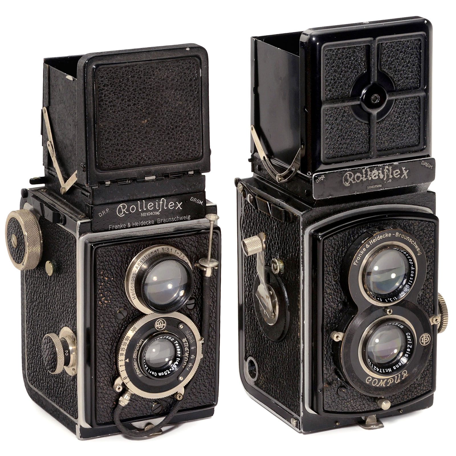 Franke & Heidecke, Braunschweig. 1) Rolleiflex 6 x 6, 1929, no. 104096, Tessar 4,5/7,5 cm, no. 1247592, Compur 1–1/300 sec. (long shutter speeds 1–1/5 sec. stuck). (3/3) – And: 2) Rolleiflex Standard 3,5, 1934, no. 428286, Tessar 3,5/7,5 cm, no. 1742116, Compur. (3/2–3)