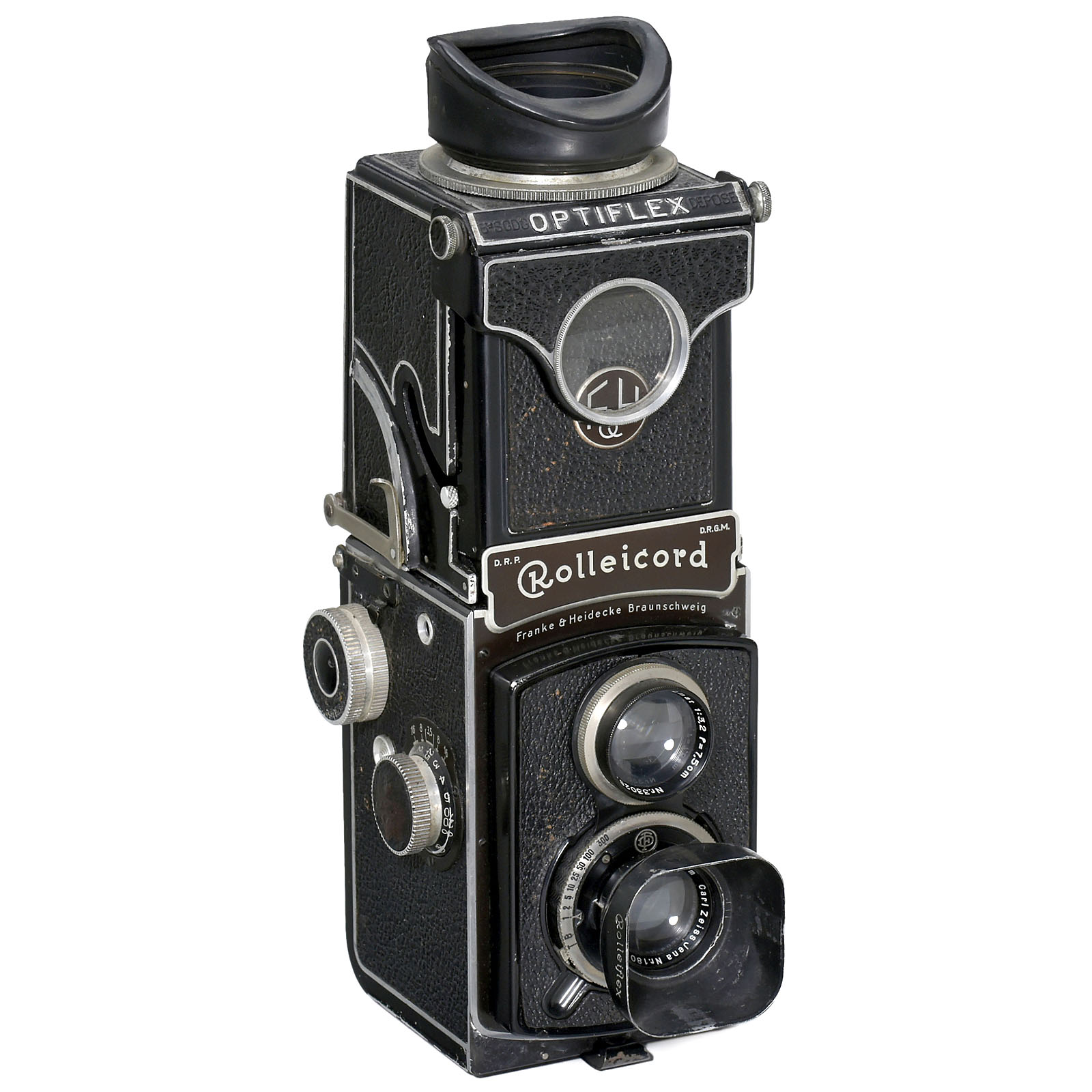 Franke & Heidecke, Braunschweig. No. 1801703 (Triotar), with Triotar 3,5/7,5 cm in Compur. With rare French "Optiflex" viewfinder attachment.