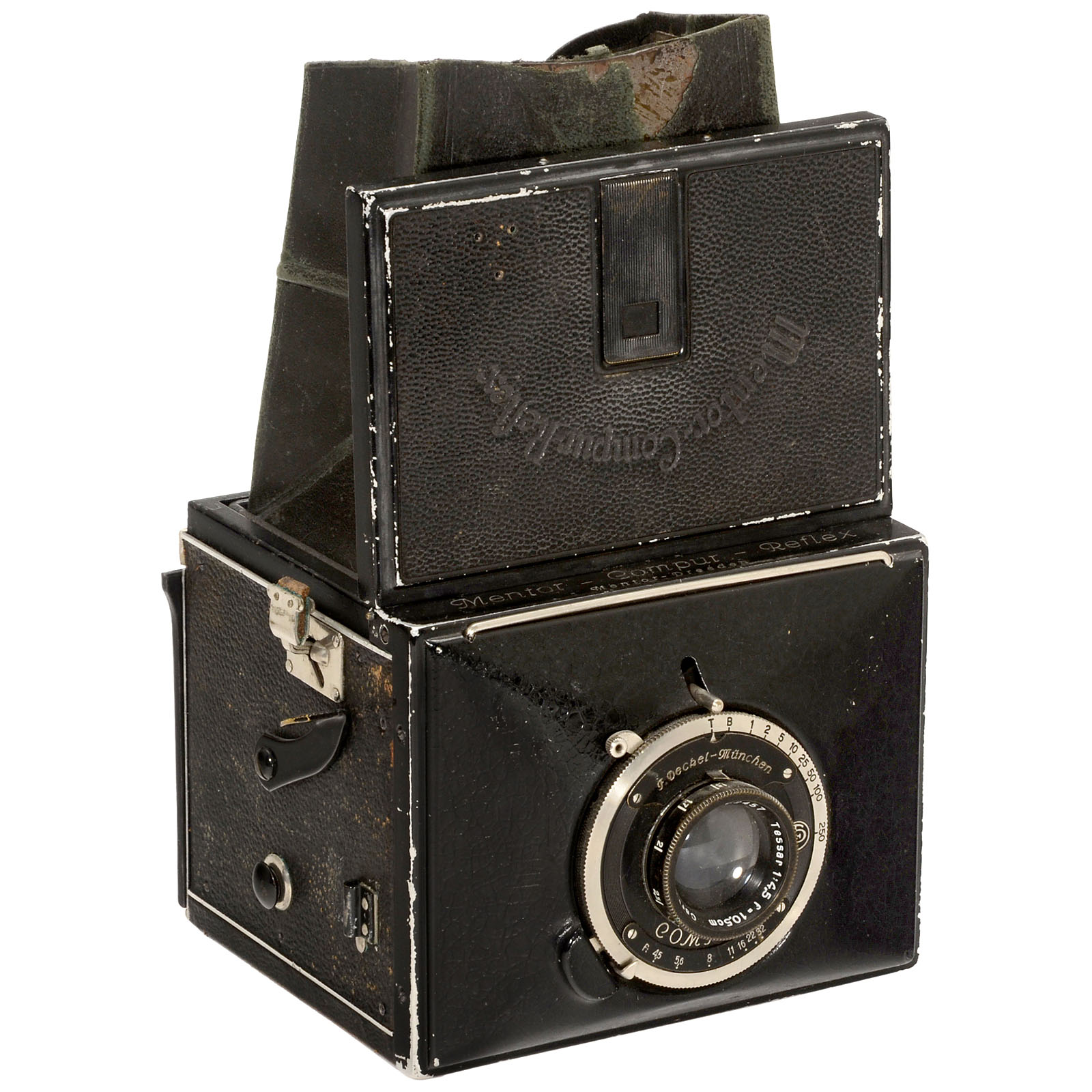 Mentor-Kamerafabrik, Goltz & Breutmann, Berlin & Dresden. Size 6,5 x 9 cm, on plates and rollfilm, SLR camera, Tessar 4,5/10,5 cm in Compur, working, focusing screen back. Rare SLR camera in very good condition, sought-after!