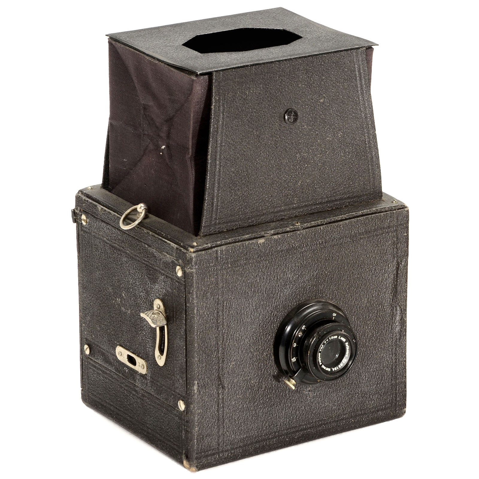 Franz Kochmann, Dresden. Box-form SLR for plates of 8,2 x 10,7 cm (rarest version), with Laack Normal Polynar 6,8/12 cm, shutter and M + Z switch not working.