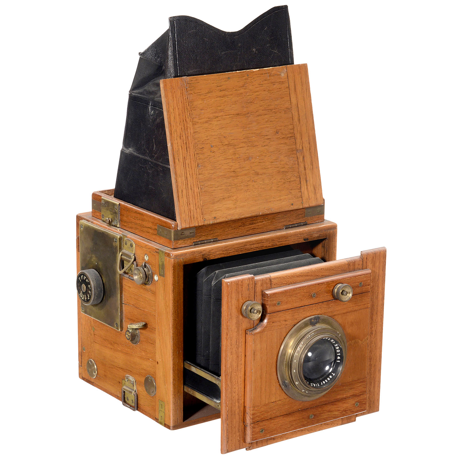 G. Rüdenberg, Hanover. SLR camera for plates of 9 x 12 cm, tropical wood with brass fittings, brass Tessar lens 4,5/15 cm (no. 390141), black bellows, focal plane shutter (not working), focusing screen back. – Rare! – Literature: Abring II, no. 1579.
