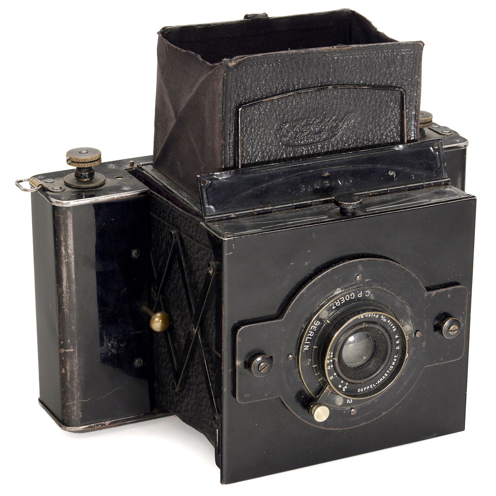 Fritz Kricheldorff, Berlin, N.W. 6. D.R. patent Doppel-Anastigmat 4,6/120 lens. Shutter stuck, mirror loose, focusing screen with crack. According to Frerk: The first folding reflex in the world! – Literature: Abring No. 579. – Great rarity!