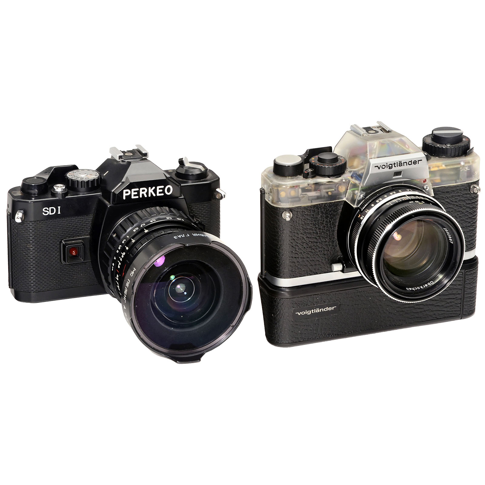 2 interesting Voigtländer SLR cameras: 1) Perkeo SDI, c. 1987, traditional name for a new camera generation, only small production series, with Russian fish-eye lens 2,8/17 mm. – And: 2) Voigtländer (VSL 3-E) with transparency cover plate, with winder and Opton PL 1,4/50 mm HFT Oberkochen.