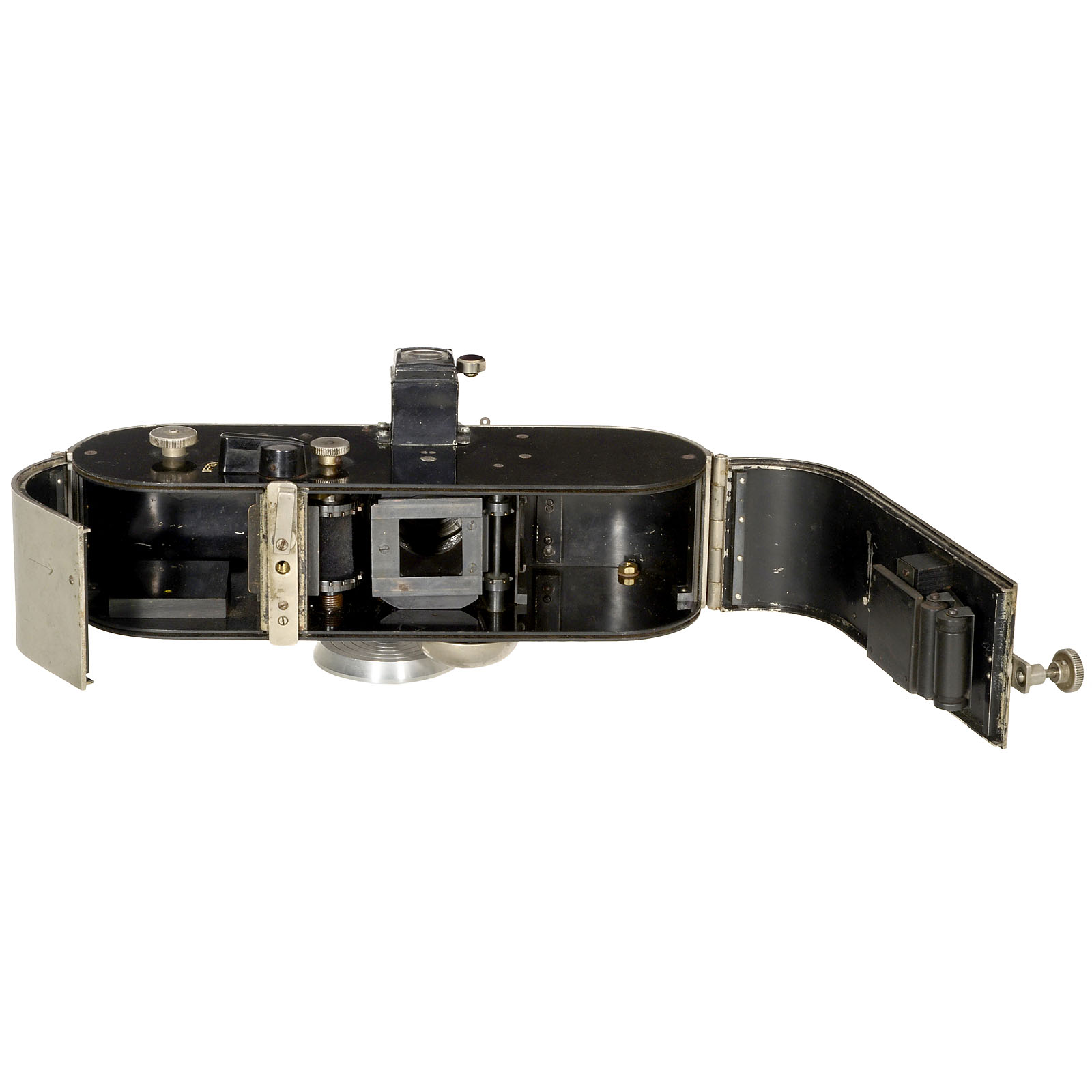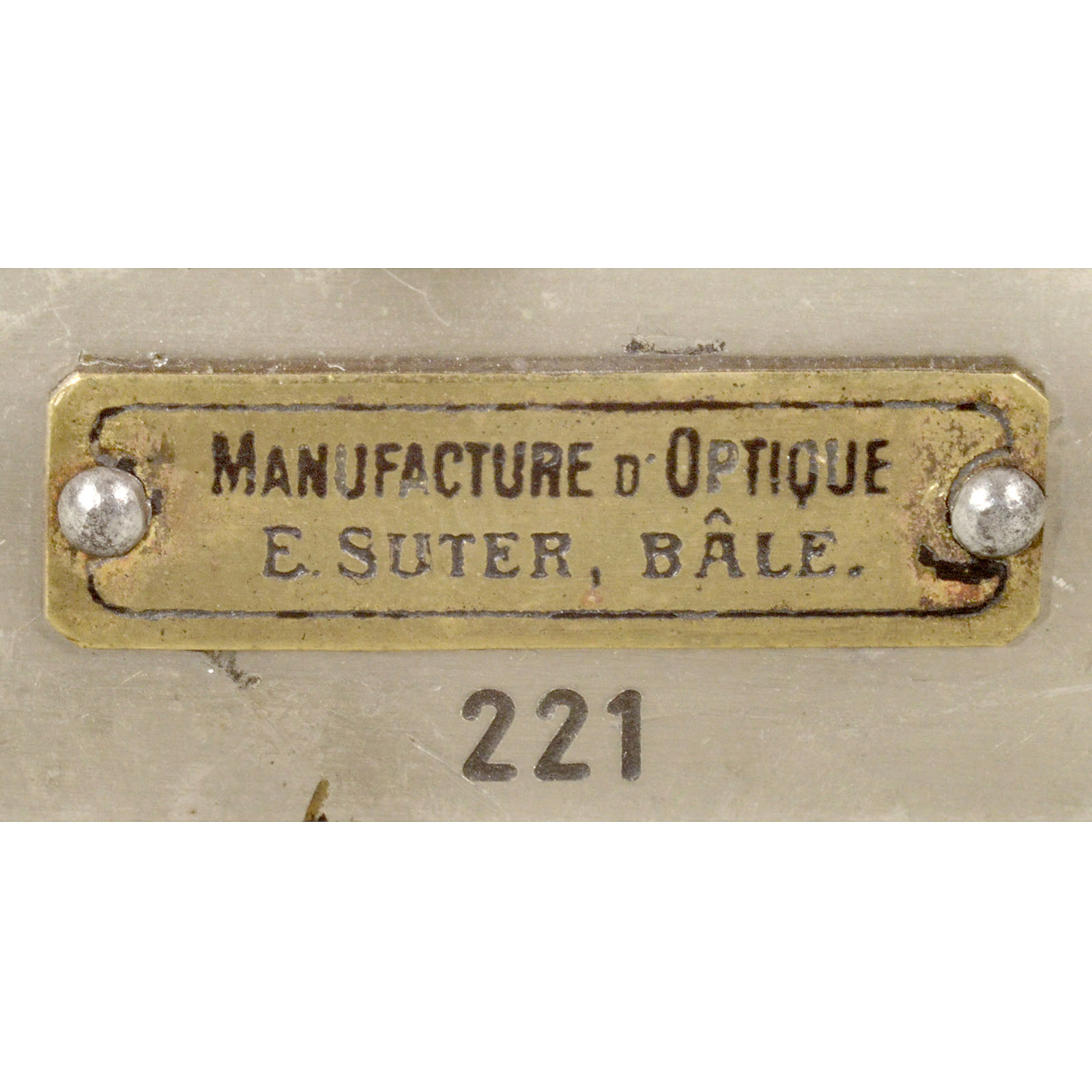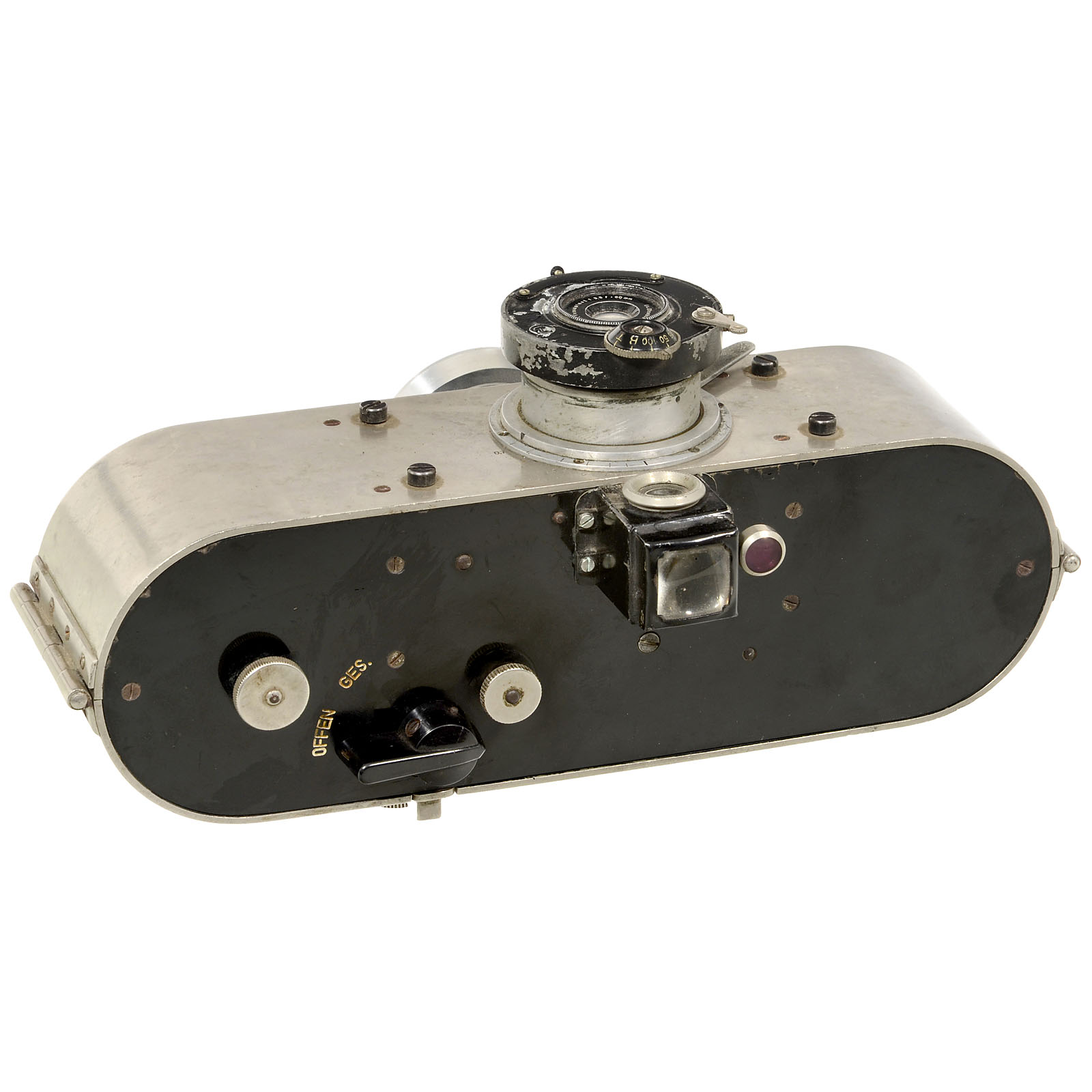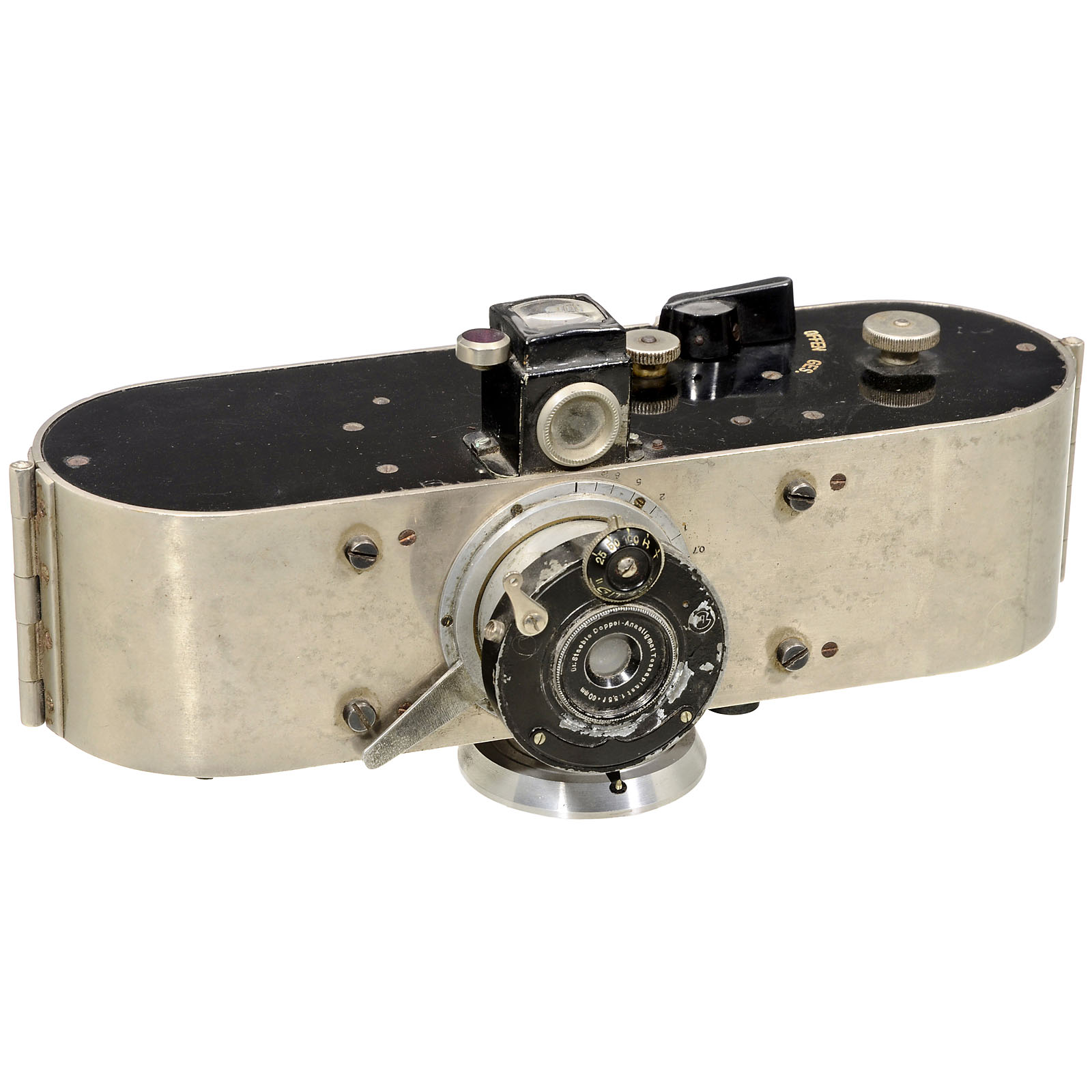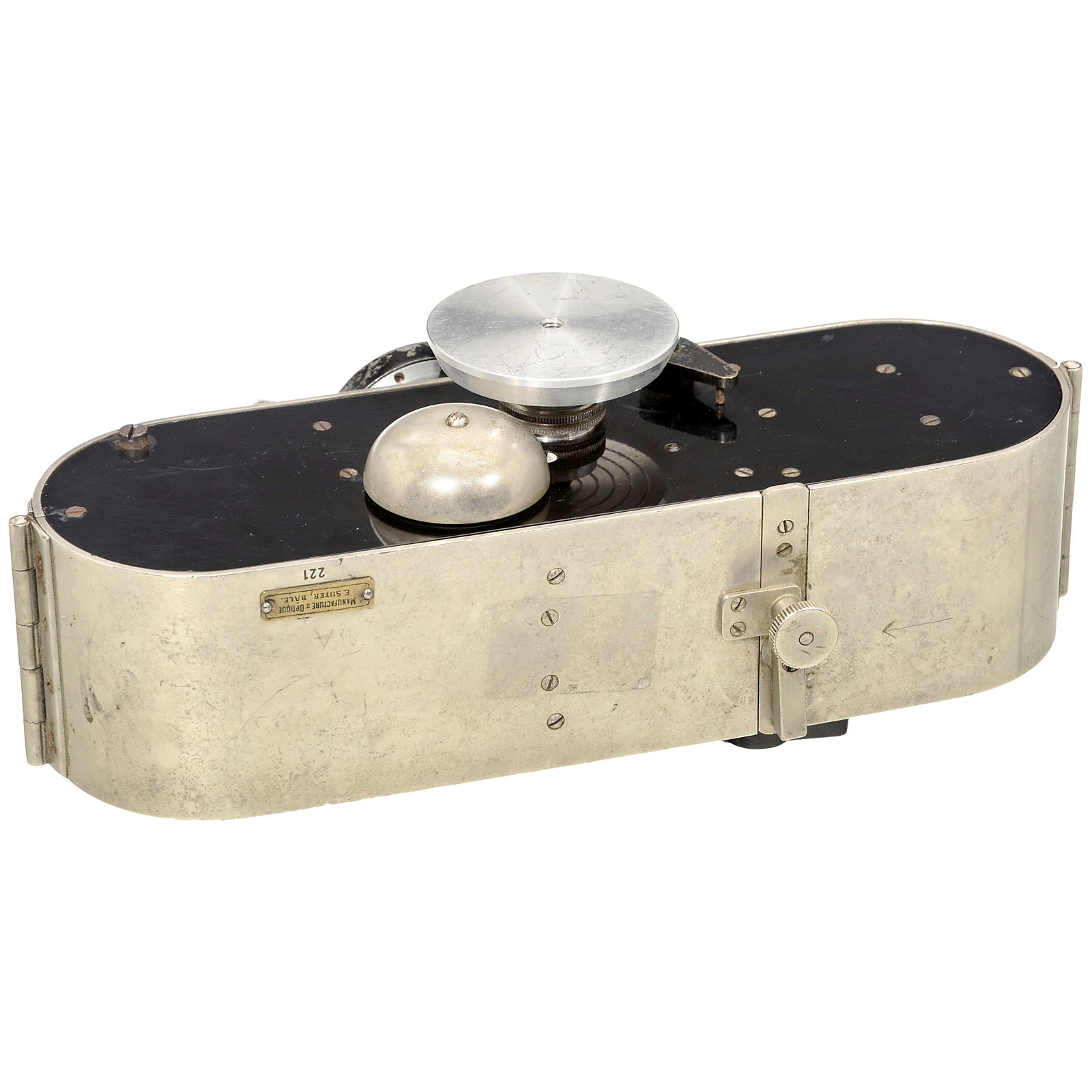 "E. Suter, Bâle". Reporter camera for 250 pictures, image size 24 x 24 mm, body no. 221, lens: Staeble Doppel-Anastigmat Tessaplast 5,5/60 mm (without serial number), shutter "Gitzo" 1/25–1/100 sec., B + T. Brillant viewfinder. Provenance: Dr. Loher, Munich, probably acquired during the 1930s.
