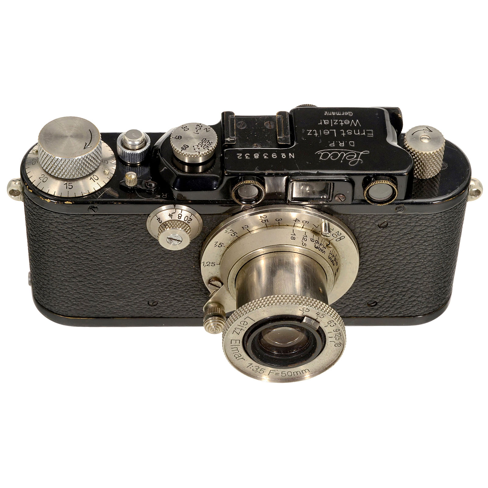Leitz, Wetzlar. No. 93832, black/nickel, partly converted to Leica III: slow speeds, strap lugs, diopter adjustment. Elmar 3,5/50 mm, nickel, meter, bakelite lens cap.