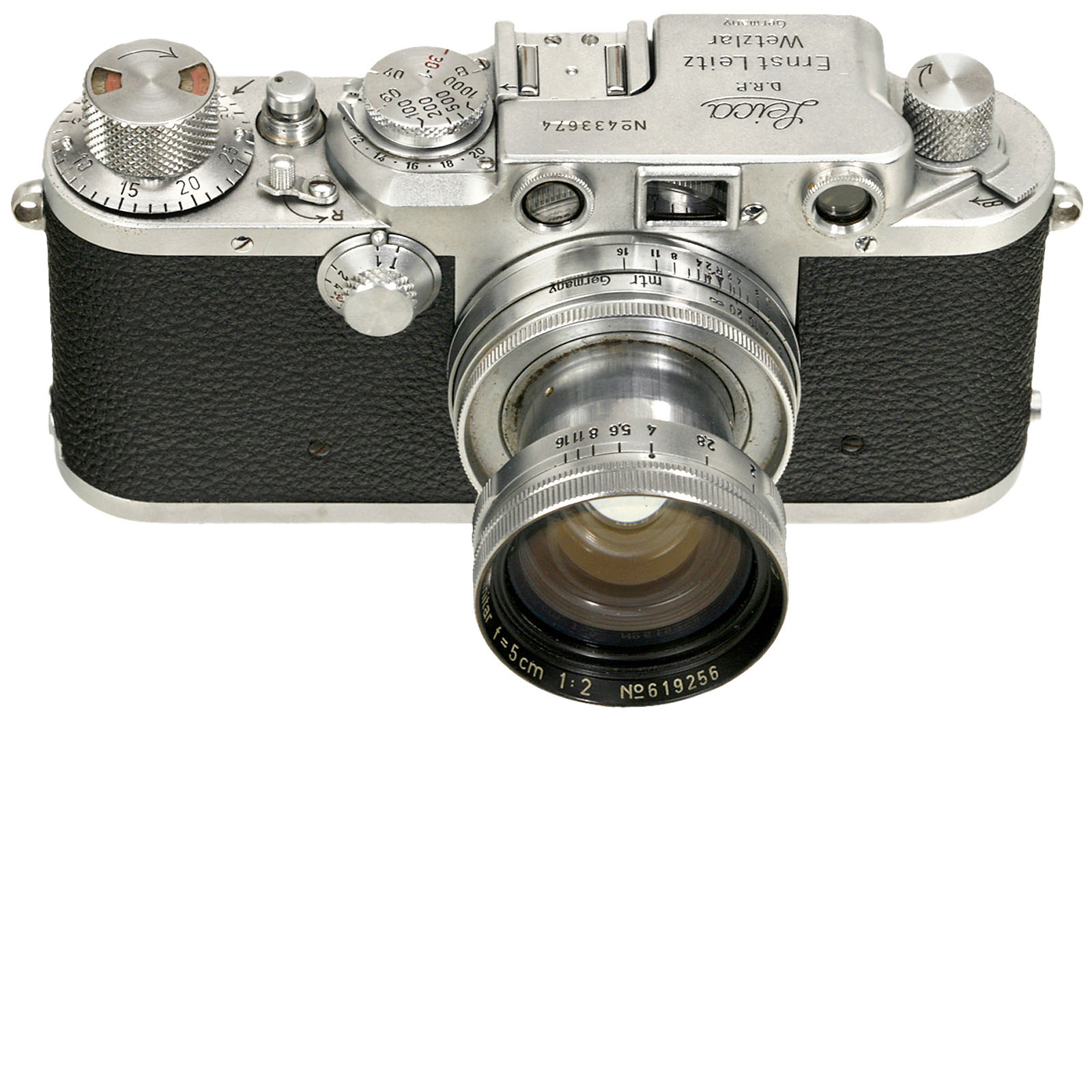 Leitz, Wetzlar. No. 433674, Leica IIIc converted to Leica IIIf, eyepiece missing. With Summitar 2/5 cm, no. 619256, metric.
