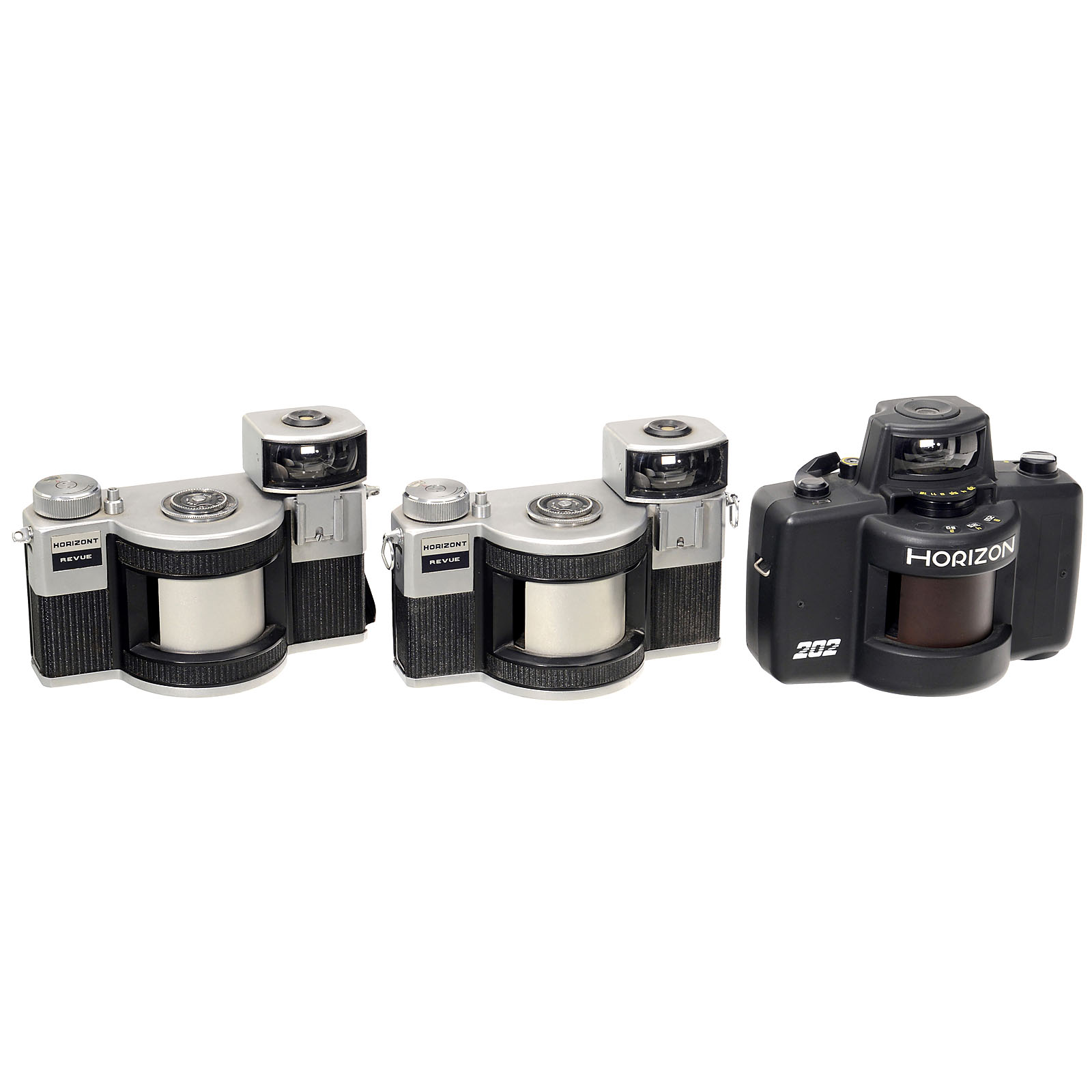 KMZ, USSR. 1–2) 2 x Horizont Revue, 1969, size 24 x 58 mm on 35mm film, lens 2,8/28 mm, shutter speeds 1/30–1/250 sec. (3–4/3+) – And: 3) Horizon 202, c. 1980, shutter speeds ½–1/250 sec., lens MC 2,8/28 mm, lock on camera back damaged. (3/5)