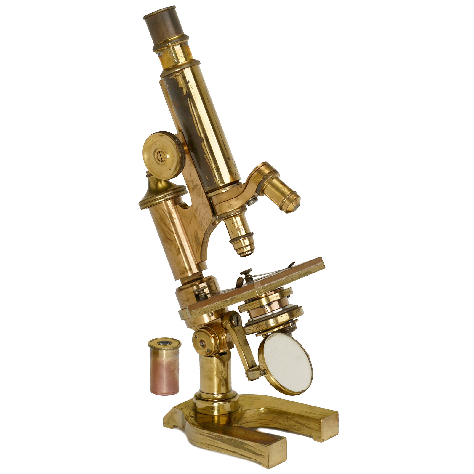 Leitz, Wetzlar. No. 68966, original lacquered and oxidized brass, 2 lenses in 2-lens turret and 2 oculars, rack-and-pinion focusing, tilting tripod, height 13 in., with wooden box.