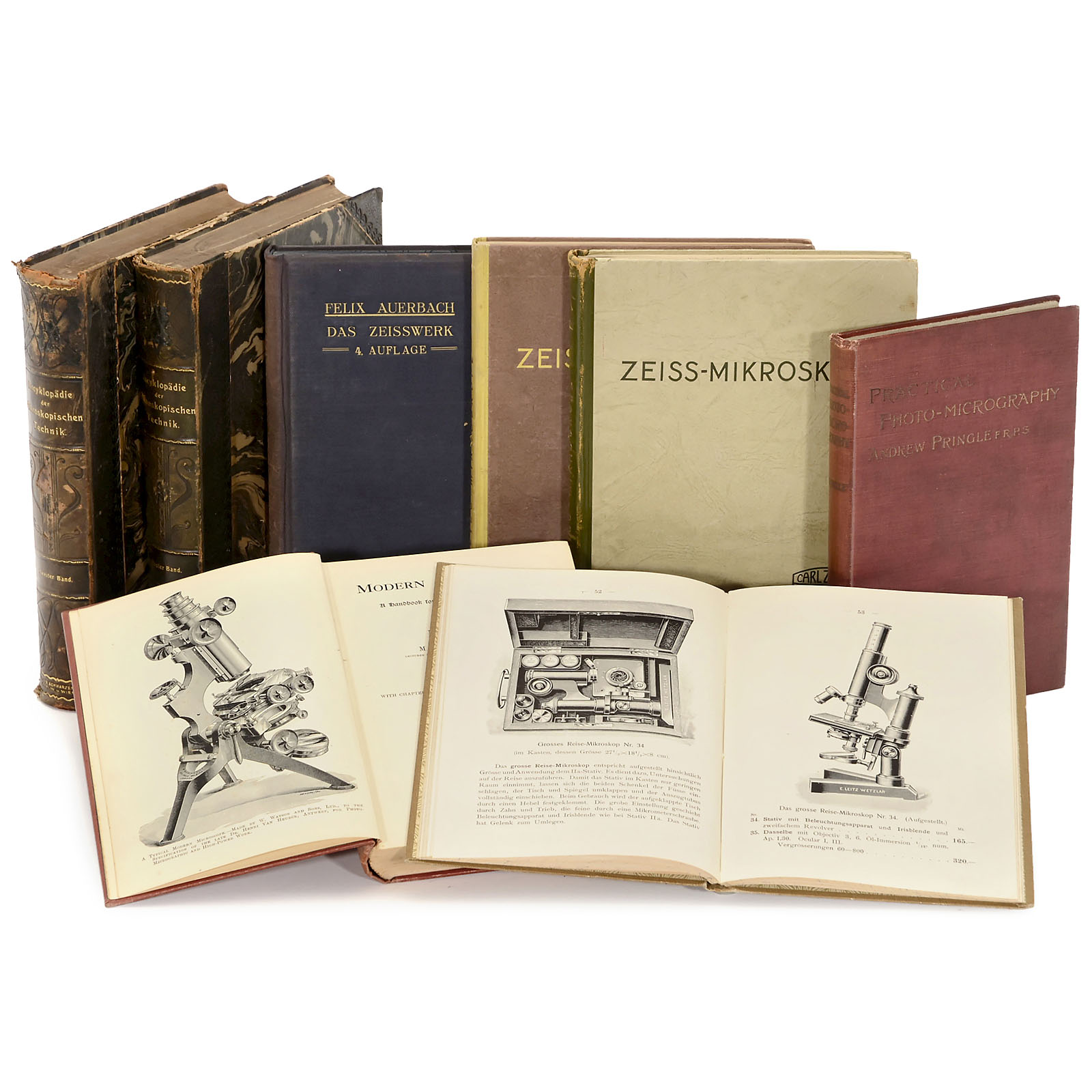 1–2) Carl Zeiss Jena. 2 books "Zeiss-Mikroskopie", 1934 and 1939, approx. 150 and 180 pages, excellent condition. – 3) Felix Auerbach, "Das Zeisswerk – 4. Auflage –", 1914, 200 pages. – 4) Ernst Leitz. "Mikroskope und Nebenapparate Nr. 40", 1902, 102 pages. – 5–6) 2 English books "Microscopy", 1902 and 1911. – And: 7–8) 2 x "Encyklopädie der Mikroskopischen Technik", 1903, first and second volume.