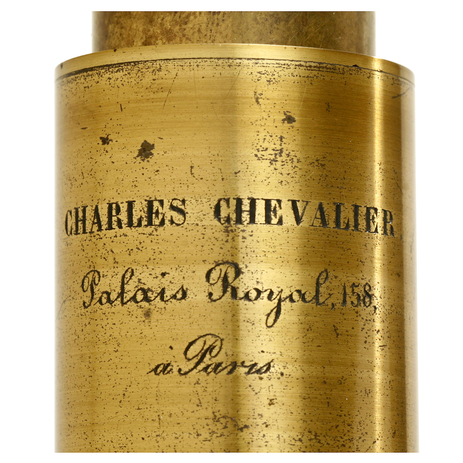 Charles Chevalier, Palais Royal, 158, à Paris. Brass, original lacquer, with lens and 2 oculars, rack-and-pinion focusing, shift tripod, tweezers, one mirror side with minimal cracks, with original wooden box.