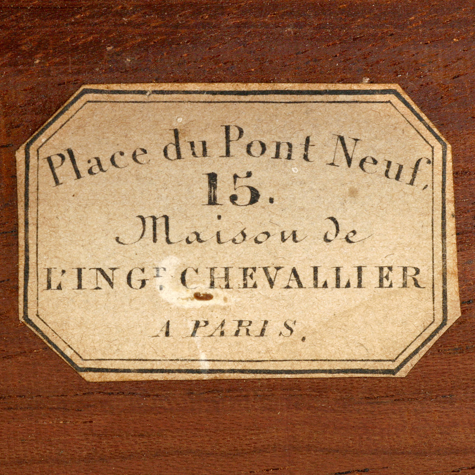 Original lacquered and blackened brass, iron base, draw tube for focusing, ball-joint tilting arm, height 7 in., in matching mahogany case, labeled "Maison de l'Ing. Chevallier, Place du Pont Neuf 15, à Paris".