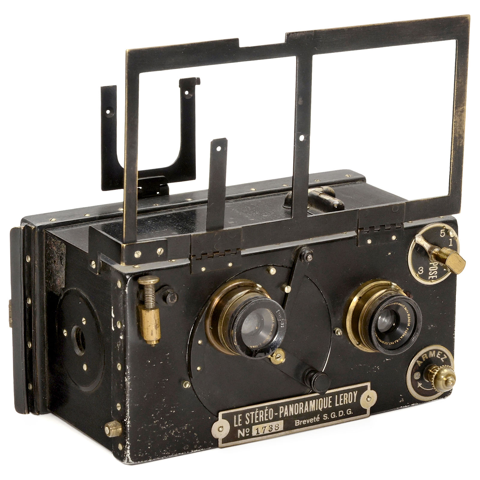 Lucien Leroy, Paris. Stereo and panorama camera for plates of 6 x 13, lenses: C.P. Goerz Dopp.-Anastigmat 8,5/80 mm, rotating guillotine shutter with 5 different speeds, iris-type diaphragms of 8,5 to 45, frame viewfinder for stereo and panoramic pictures. One of the lenses is mounted eccentrically on a circular panel and can be moved for shooting panoramic pictures from the center of the camera.