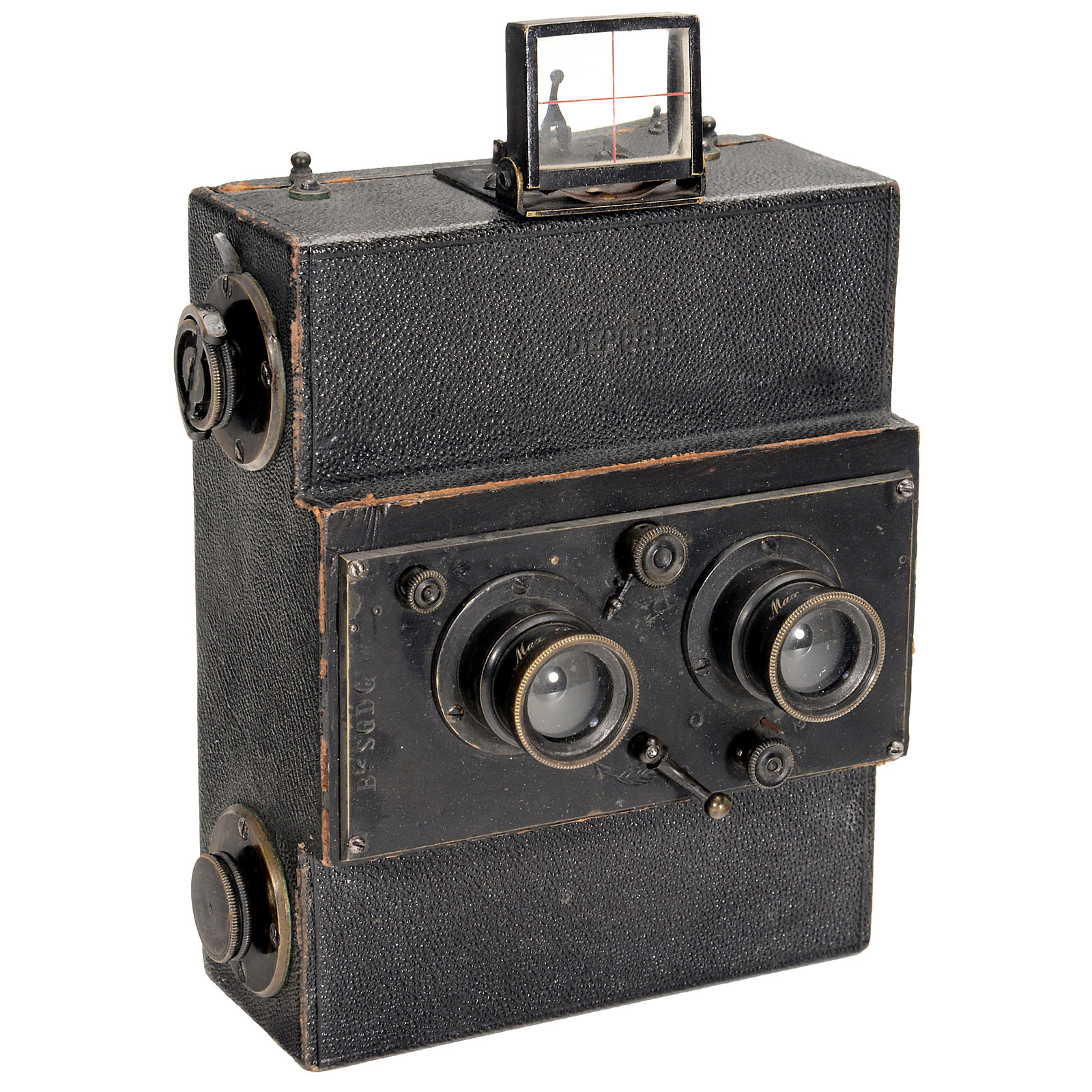 Max Balbreck, Paris. For 9 cm wide rollfilm, size 2 times 4,3 x 4,7 cm, 2 lenses by "Max Balbreck", shutter I + P, working, body no. 86. – Literature: "Stereo Skopie", Museum für Verkehr und Technik, no. 85.