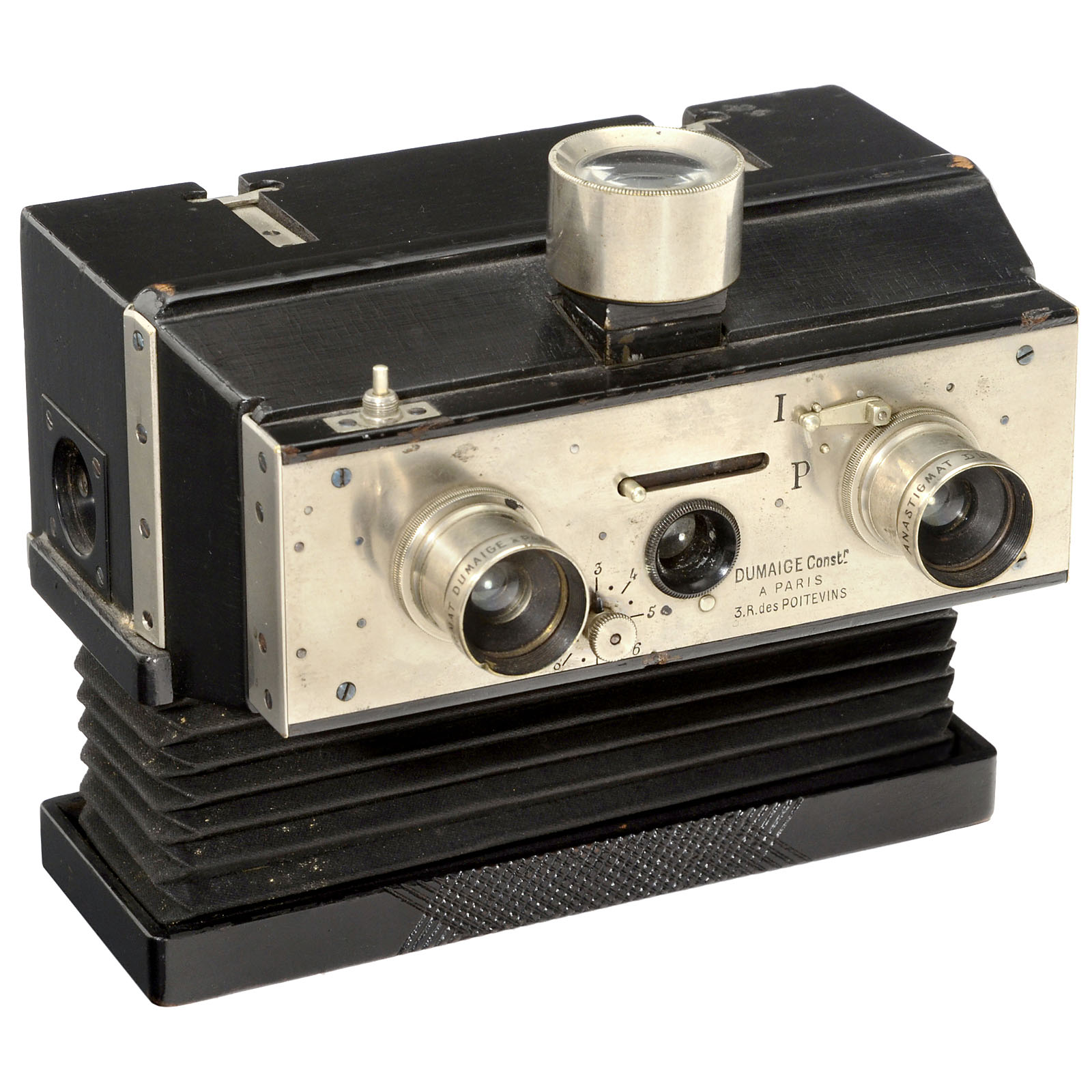 "Dumaige Constr a Paris, 3. R. des Pointevins". Plate size 4,5 x 13 cm, 2 x Dumaige Anastigmat F=53 mm, shutter speeds 1–8 (I + P), unusual construction. Not referenced in the major literature!