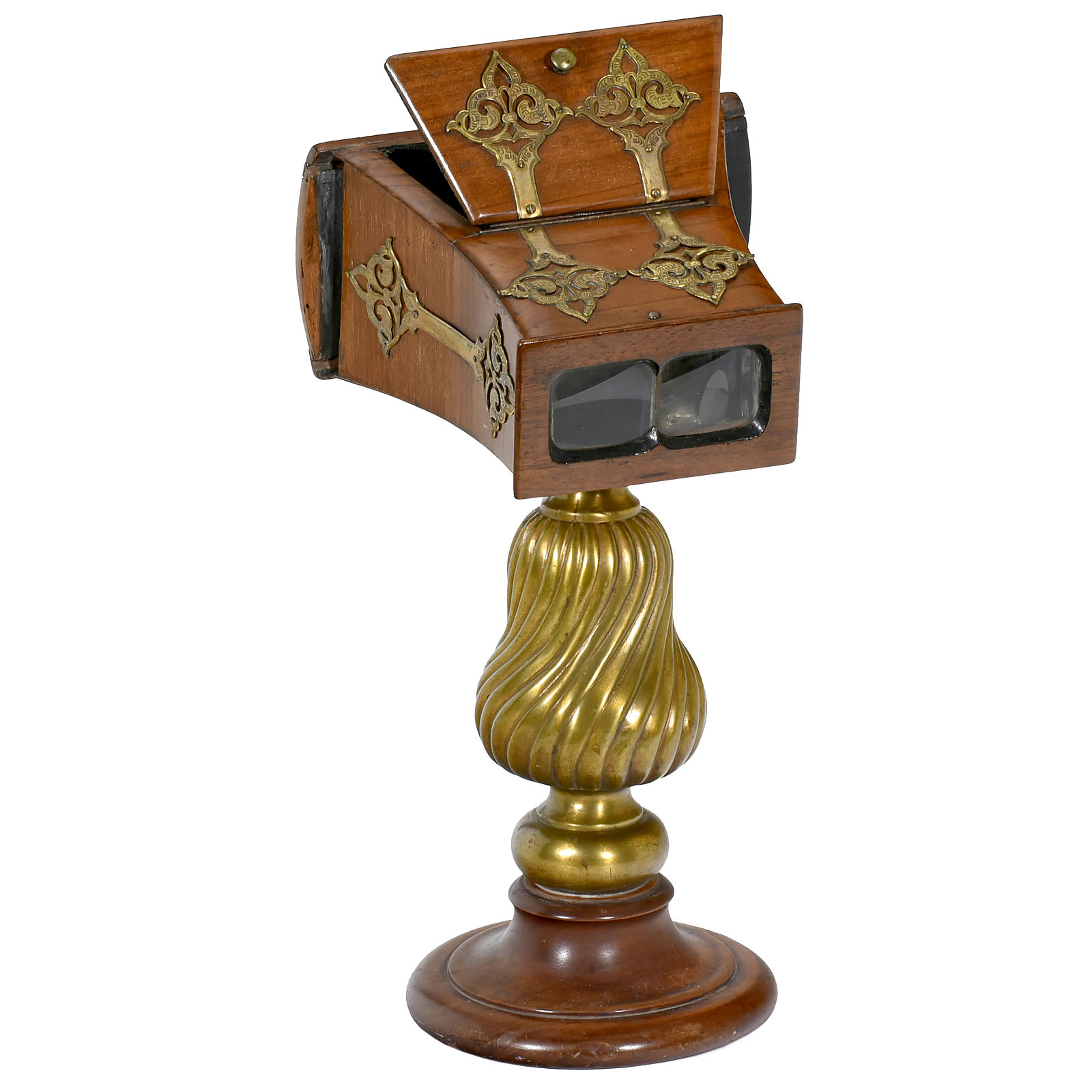Brass-decorated Brewster-type stereo viewer for cards or glass plates 9 x 18 cm, adjustable mirror-reflector (presumably after Charles Sands), with baroque stands. The ground glass has been exchanged for a non-transparent plate. – Literature: P. Wing, "Stereoscopes", p. 11.