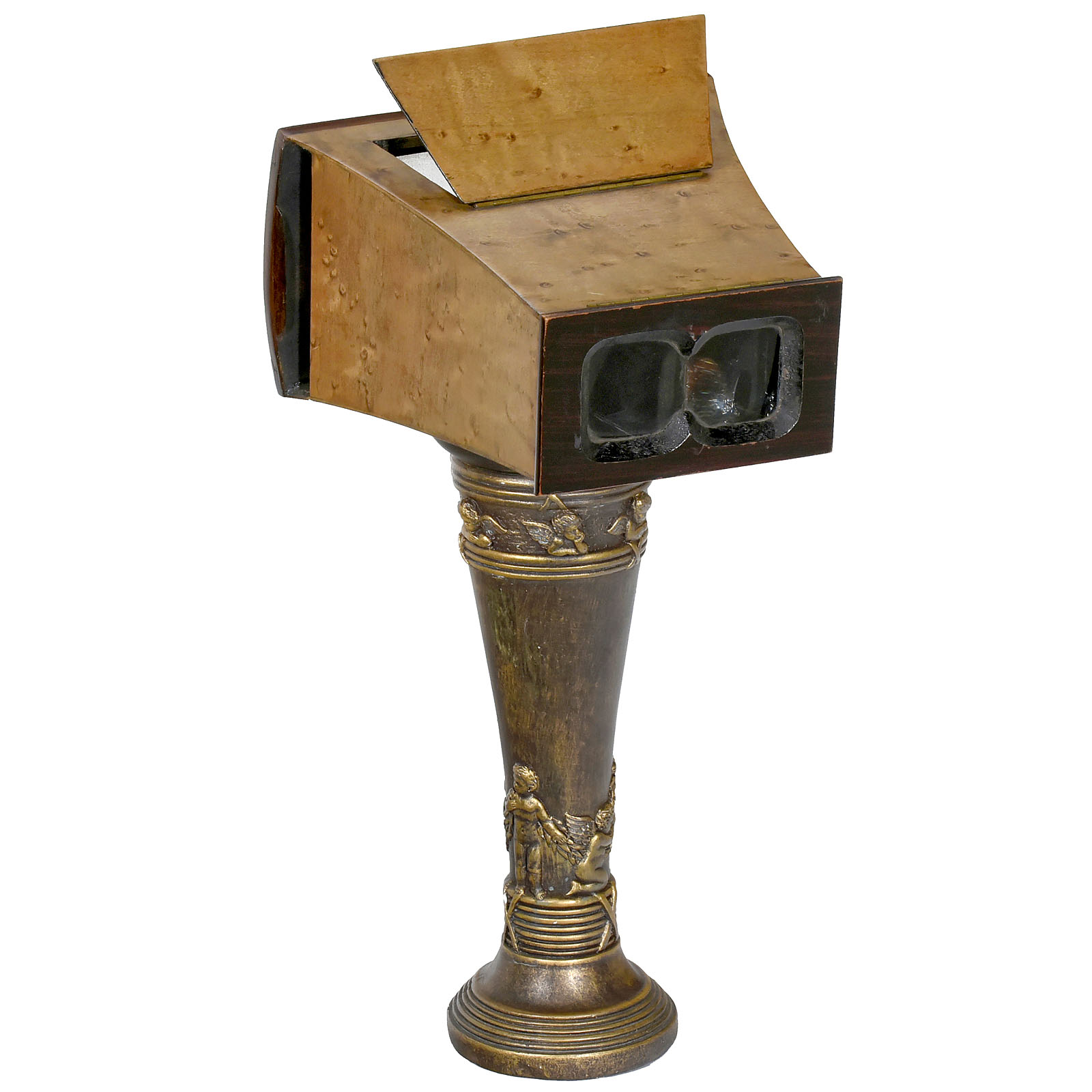 Brewster-type stereo viewer for cards and stereo glass plates of 9 x 18 cm, firmly linked to a richly decorated stand, plated with root wood.