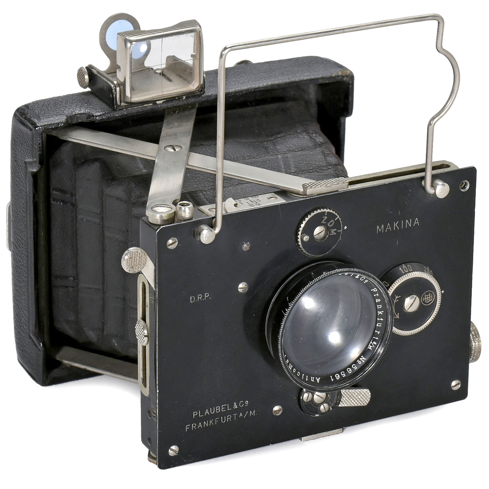 Plaubel, Frankfurt. Small strut construction camera for plates 4,5 x 6 cm, Anticomar 2,8/7,5 cm, Compur 1–1/250 sec., focusing screen back. Excellent condition, sought-after 4,5x6cm camera!