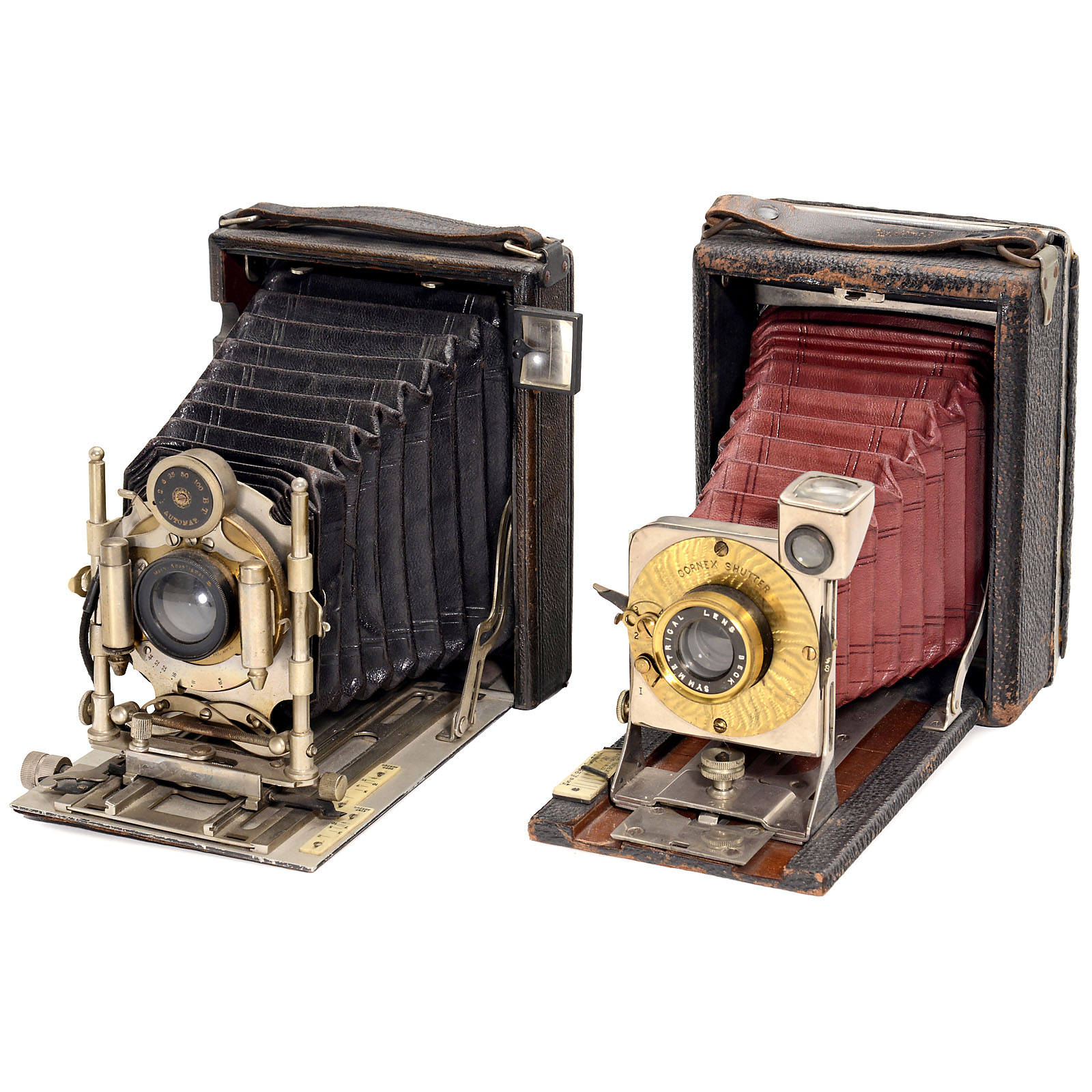 R. & J. Beck, London. Folding-bed camera 3 ¼ x 4 ¼ in. for special "cut film in Zambex skeleton" (not plates), interlock mechanism from back needs attention, with Beck Symmetrical Lens in attractive golden Cornex shutter. (4/4) – In addition: German 9 x 12 cm folding-bed camera "Feca", c. 1900, Mars-Anastigmat 1:6,8 in Automat, not working, focusing screen back (without screen). (4/4)